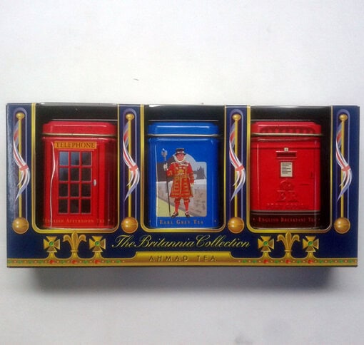 Kit com 3 latas decoradas de chá inglês Ahmad Tea. São três sabores diferentes num só kit, e as latas são ótimas para guardar e utilizar como decoração. Saboreie clássicos como o English Breakfast, Earl Grey e English Afternoon Tea.